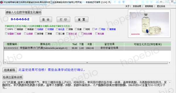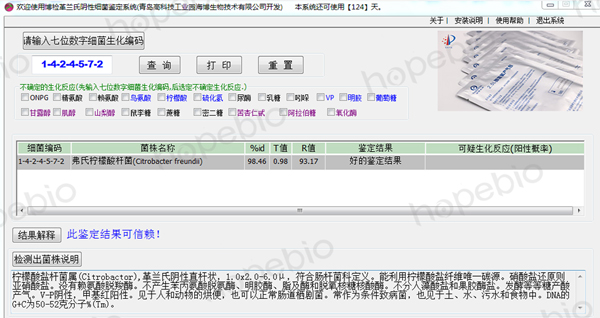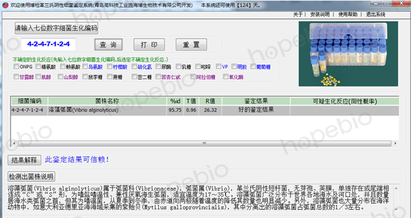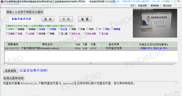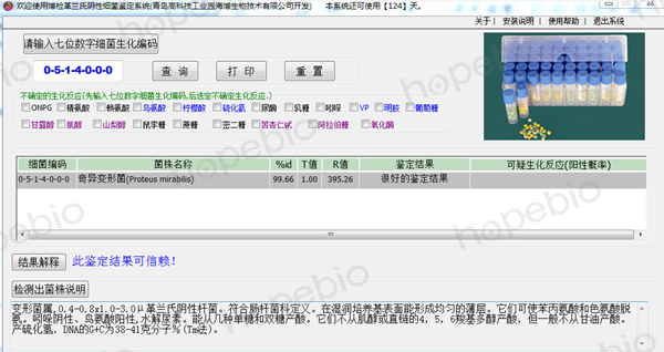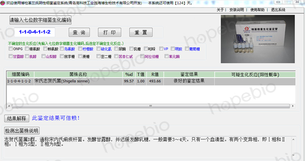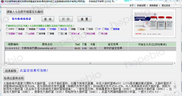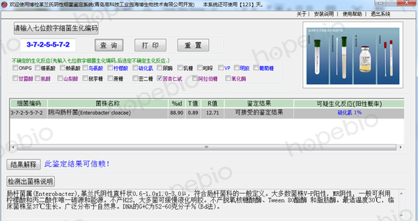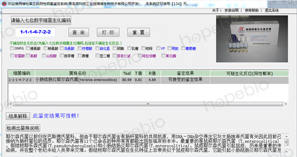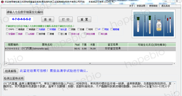 不同种属的细菌具有不完全相同的生化特征。本系统选取21种典型生化试验(20孔生化鉴定条和一个氧化酶试纸),并把生化反应的结果转换为一个8进制数,通过提供的标准数据库查询系统可得到实验菌株归属的相对概率、T值和R值,对菌株的归属进行一定程度的鉴定。