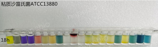 10孔为V-P试验,有些细菌分解葡萄糖过程中会产生乙酰甲基甲醇,在碱性溶液中乙酰甲基甲醇被氧化后可与胍基反应生成红色化合物,因此加入VP试剂(V-P试剂盒)后变红为阳性反应,颜色不变或棕黄色为阴性反应;