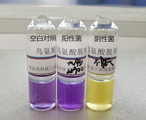 2、3、4孔分别为精氨酸、赖氨酸和鸟氨酸脱羧酶试验,有些细菌可产生某种氨基酸脱羧酶,使该种氨基酸脱去羧基生成胺,使培养基呈碱性,此反应需在厌氧、酸性环境中进行,培养基中含有葡萄糖,前期细菌发酵葡萄糖产酸,继续培养时,氨基酸脱羧产胺使培养基变碱,溴甲酚紫为酸碱指示剂,因此溶液呈紫色为阳性反应,黄色为阴性反应。