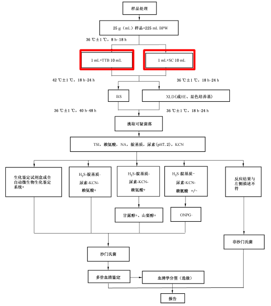 也就是说,TTB增菌液分别在标准中列出的BS和XLD上划线,SC增菌液也要分别在BS和XLD上划线, 最后两种增菌液中划线检出的可疑菌株都要进行下一步检验。