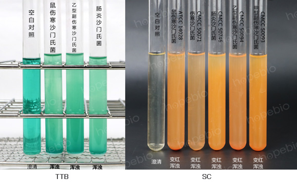 从表中可以明显看出,两种培养基除了一些基本的营养成分外,最大的区别就是抑菌剂的选择不同。TTB中选用了胆盐、硫代硫酸钠、四硫磺酸钠(四硫磺酸钠是在培养基加入碘液时形成)和煌绿作为抑菌剂,抑菌能力较强;而SC则选用了较单一的亚硒酸氢钠作为抑菌剂。