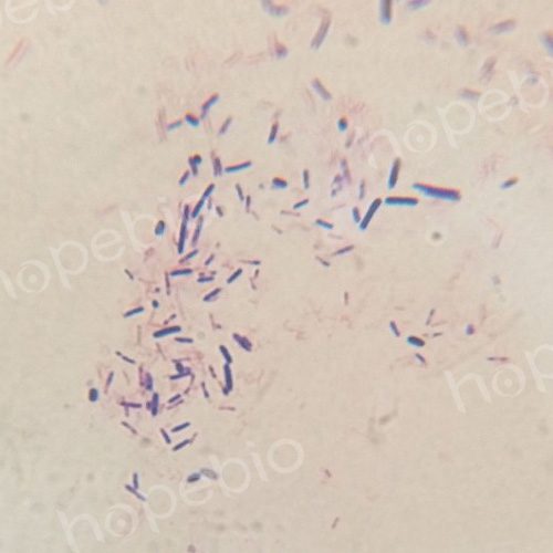 该菌的革兰氏染色为阳性,显微镜下菌体为紫色杆状,两端钝圆,部分菌体稍有弯曲。