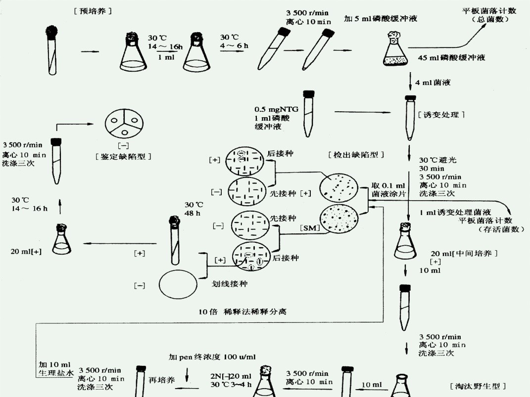 (3)涂布平板:取上述培养液的原液和10-1、10-2的稀释液各0.1mL,分别涂布于完全培养基平板上,置于37℃恒温箱中继续培养24h,然后选取合适的平板(约长有50-200个菌落)用作营养缺陷型的检查(如无合适平板,可取保存于冰箱中经青霉素处理过的菌液再行稀释、涂布)。