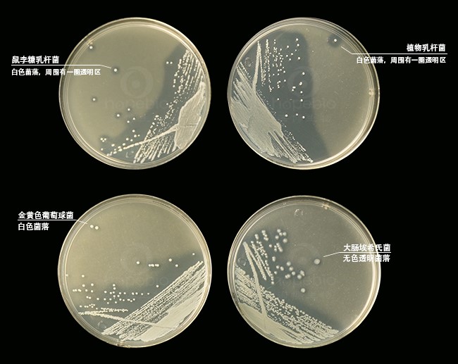 培养基中的蛋白胨、牛肉浸粉、酵母浸粉提供细菌生长所需的碳源、氮源、维生素等成分,乙酸钠、吐温80可促进乳酸菌的生长,叠氮化钠对革兰氏阴性菌有一定的抑制作用,硫酸镁、硫酸锰、硫酸亚铁提供微量元素,氯化钠维持渗透压,琼脂为凝固剂,碳酸钙为指示剂,乳酸菌可在此培养基中生长,分解葡萄糖产大量乳酸,使培养基的pH下降,碳酸钙被溶解,菌落周围变透明。
