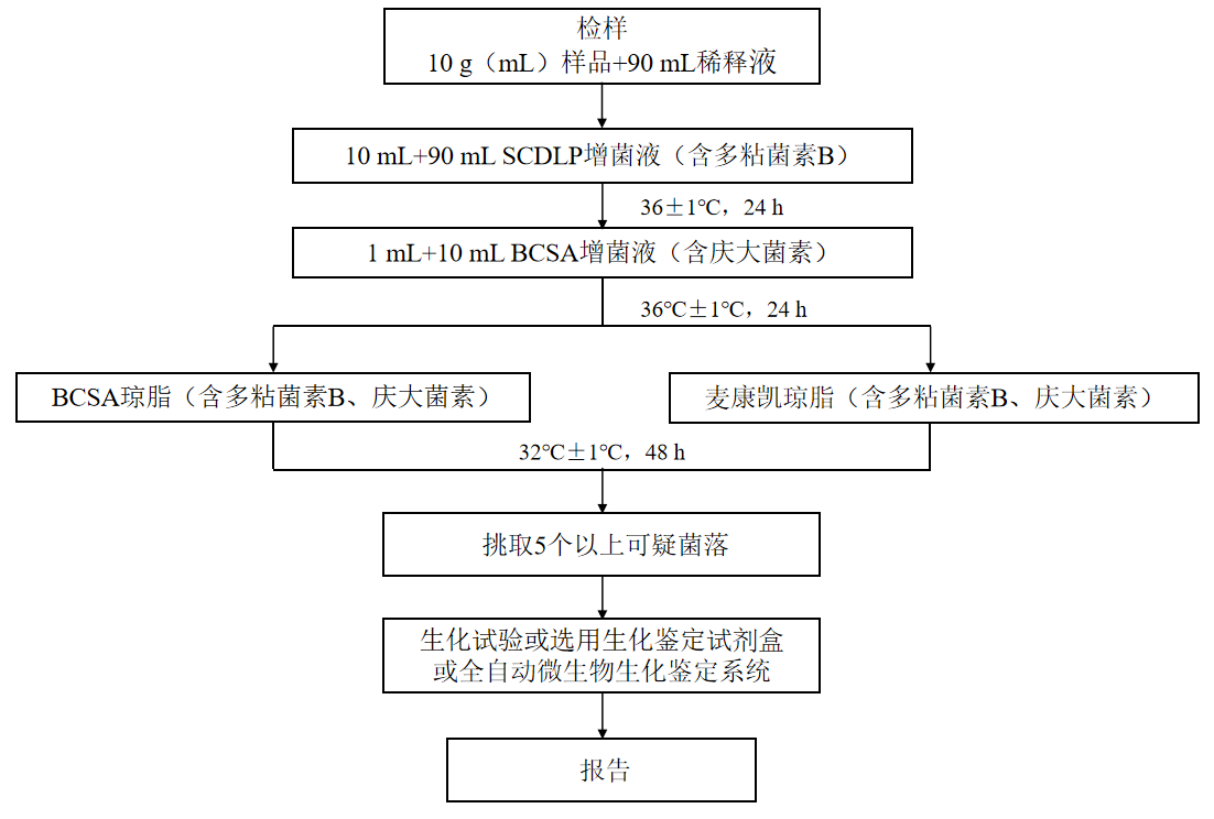按照GB 7918.1方法制备1:10化妆品稀释液,取稀释液10mL加到90mL含多粘菌素B的SCDLP增菌液中,于36℃±1℃培养24h,移取1mL,转种于10mL含庆大霉素的BCSA增菌液内,于36℃±1℃培养18 h~24 h。