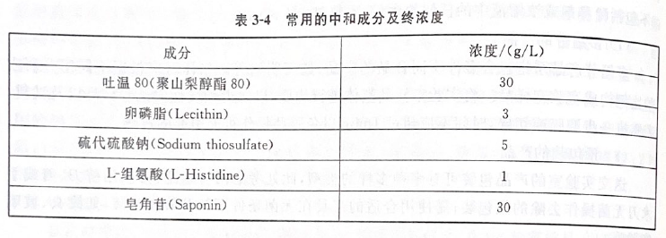 当预估存在消毒剂残留时,稀释样液和接触平板的培养基中应加入适当中和剂,以防止消毒剂对微生物的生长产生抑制作用。中和培养基的基础成分常为缓冲蛋白胨水或蛋白胨生理盐水,或是其他适当的稀释液[如1∶4浓度的林格液 (Ringer's solution)、pH7.5的磷酸盐缓冲液,1g/L的蛋白胨水溶液]。实际上并没有适于所有消毒剂的中和剂,一般情况下,吐温80(聚山梨醇酯80)和卵磷脂用于中和季铵化合物和醇类消毒剂;硫代硫酸盐用于中和含卤素和酚类的消毒剂;过氧化氢酶或过氧化物酶用作中和含过氧化物的消毒剂剂,在25℃,pH7.0±0.2条件下,一个单位的酶每分钟可催化降解1μmoI的过氧化氢。多数情况下所使用中和成分见表3-4。按所需浓度添加到1g/L蛋日胨溶液和0.85%NaCl溶液中,分装试管或瓶,121℃灭菌15min备用。