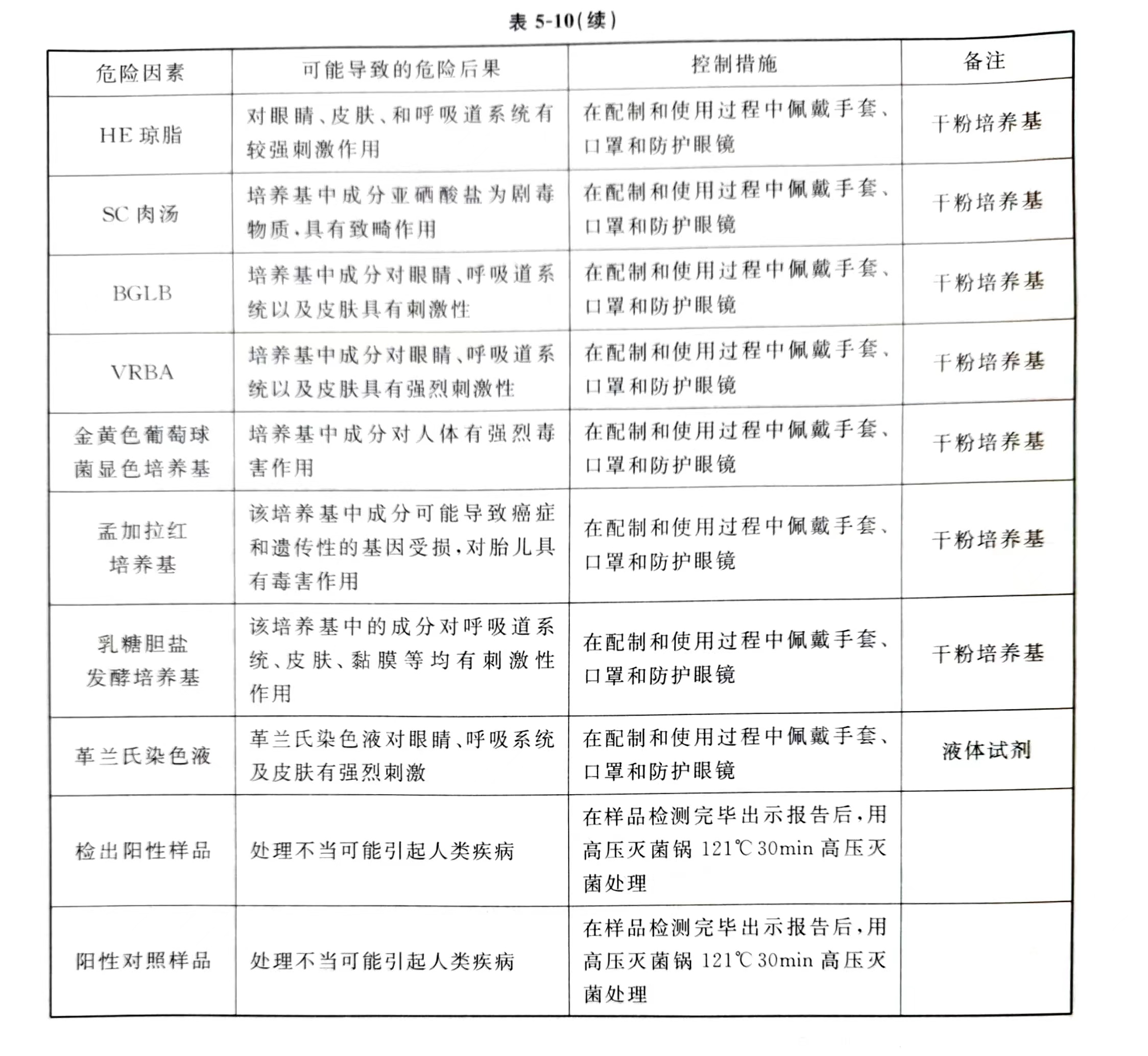 有些选择性培养基组成成分,含有抑制非目标菌生长成分,如胆盐、染料、抗生素、重金属等。此类培养基对人体基本有害,即使少量吸入也对人体有害,一般皮肤接触后需立即清洗,同时对环境也有污染。粉末状干燥培养基对人体危害主要是粉尘吸入,粉末状干燥培养基对环境危害主要随意抛弃。实验室应识别出这些危害因子,列出清单(见表5-10) ,必要时予以风险分级和防控,警示各位员工。