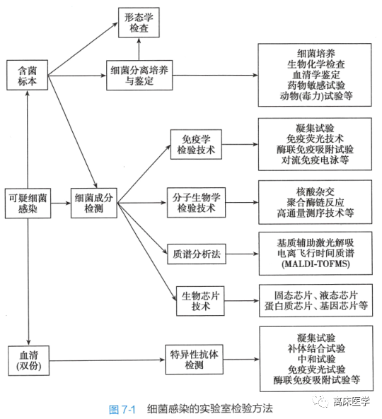 根据不同疾病采取不同标本如血、尿、粪便、咽拭子以及脑脊液等进行细菌的分离培养,观察细菌的菌落形态、生化反应、毒素的产生及血清学鉴定结果,是目前细菌感染性疾病实验室诊断的主要方法。