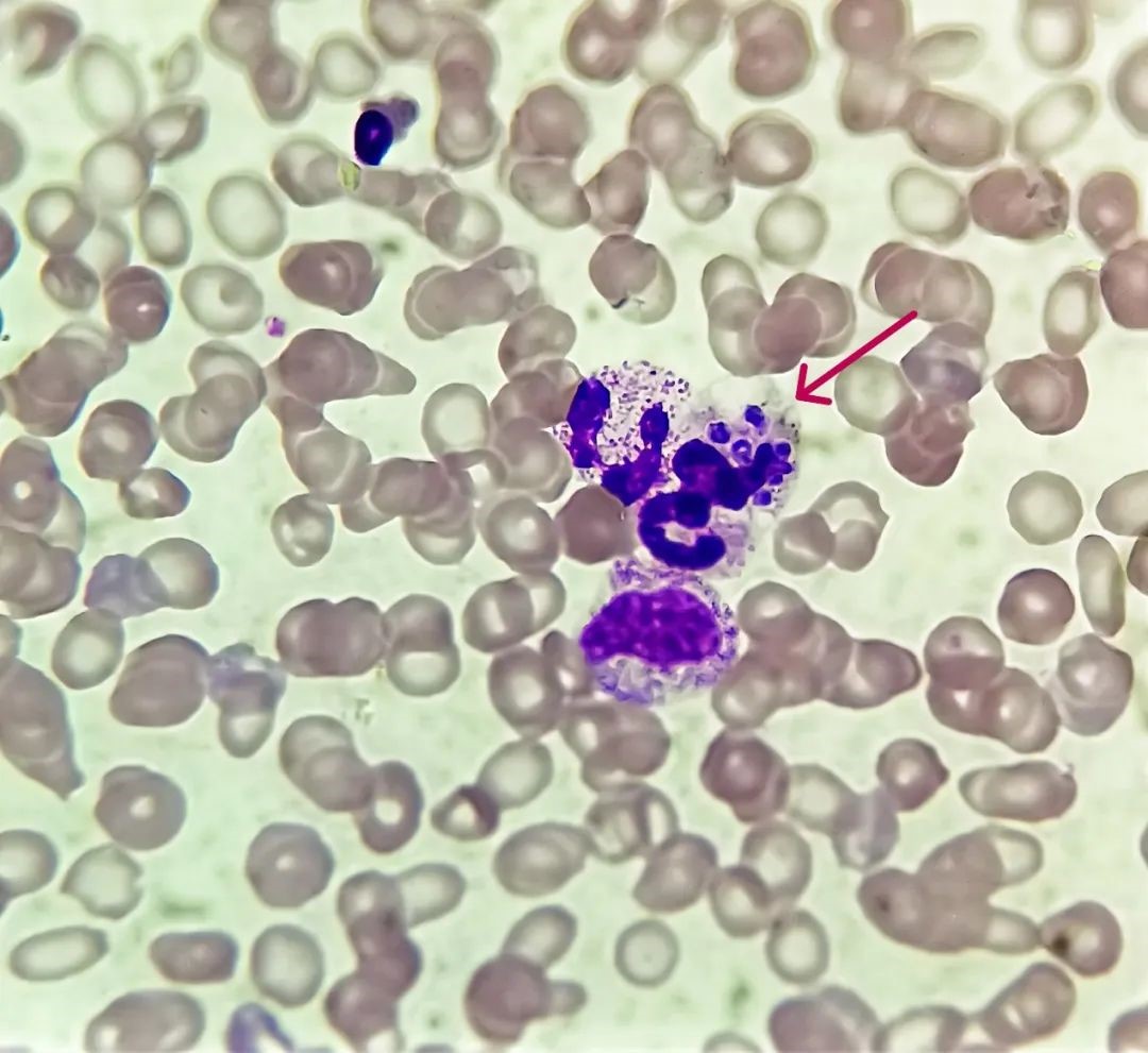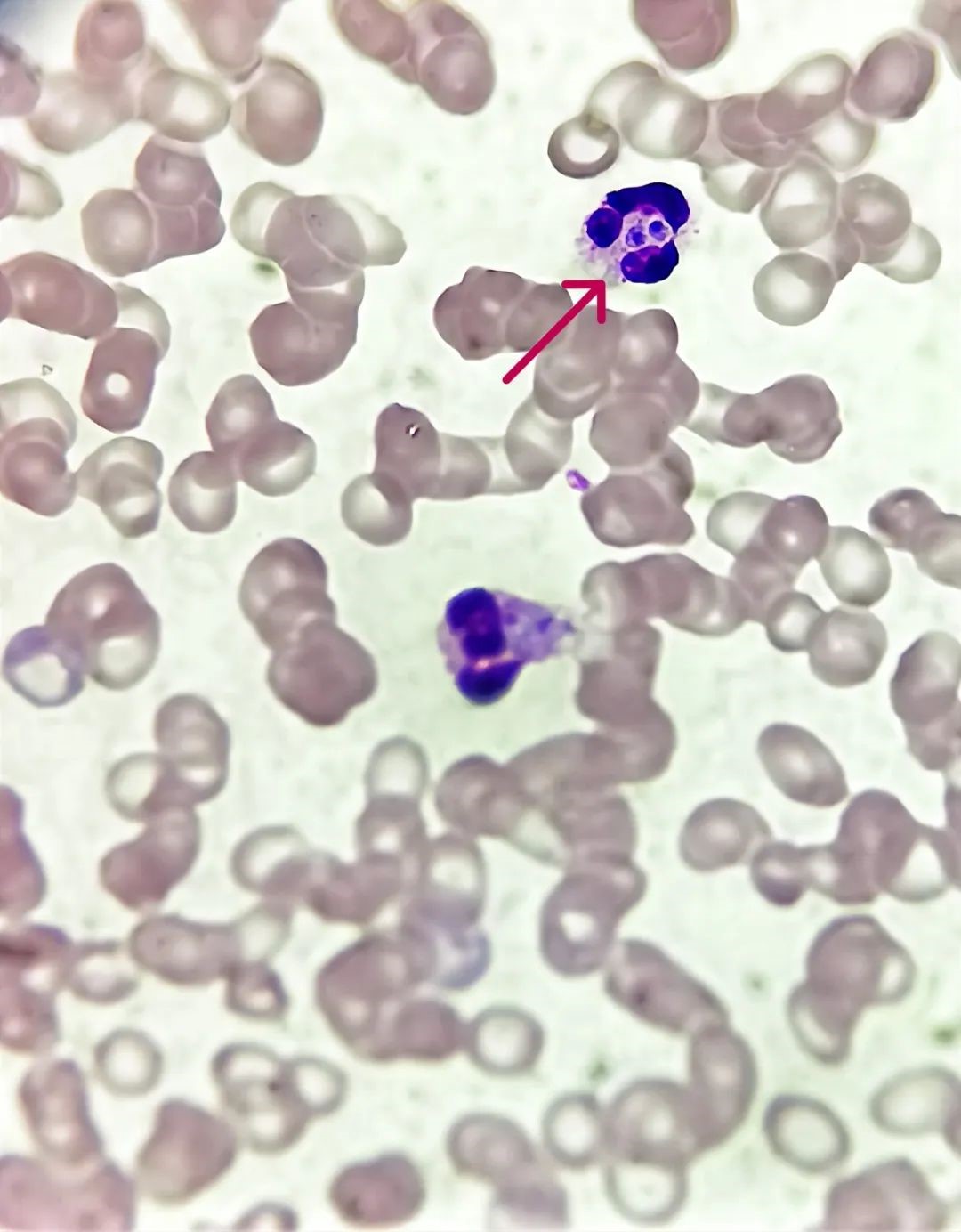 血涂片Wright-Giemsa染色后,经多名形态学有经验老师观察确认并结合患者病史情况,镜下箭头所指中性粒细胞吞噬的真菌孢子高度疑似“马尔尼菲篮状菌”。血涂片中马尔尼菲篮状菌孢子形态特征为:呈圆形或卵圆形,2-4μm大小,孢子着色不均、一端浓染,有时可见两头钝圆、中间有隔、直径3-5μm大小的腊肠孢子。