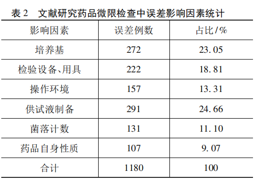 通过中国知网数据库查阅文献资料,选取部分高同质性的药品检验机构微生物实验室的文献资料,研究统计并进行综合分析,共1180例误差数据,详见表2。