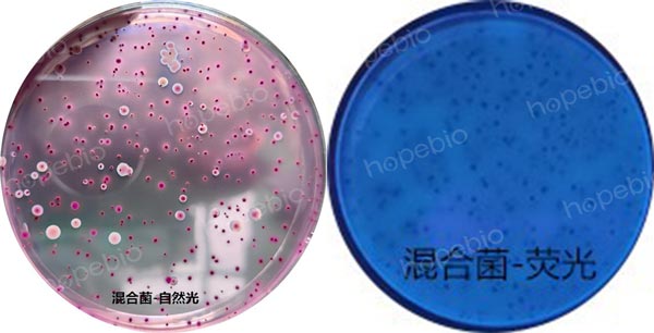 图4-2 VRBA-MUG上的混合菌在自然光和紫外光下的状态