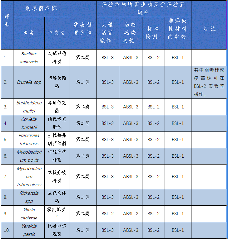 3.本表未列之病原微生物和实验活动,由单位生物安全委员会负责危害程度评估,确定相应的生物安全防护级别。如涉及高致病性病原微生物及其相关实验的,应经国家病原微生物实验室生物安全专家委员会论证。