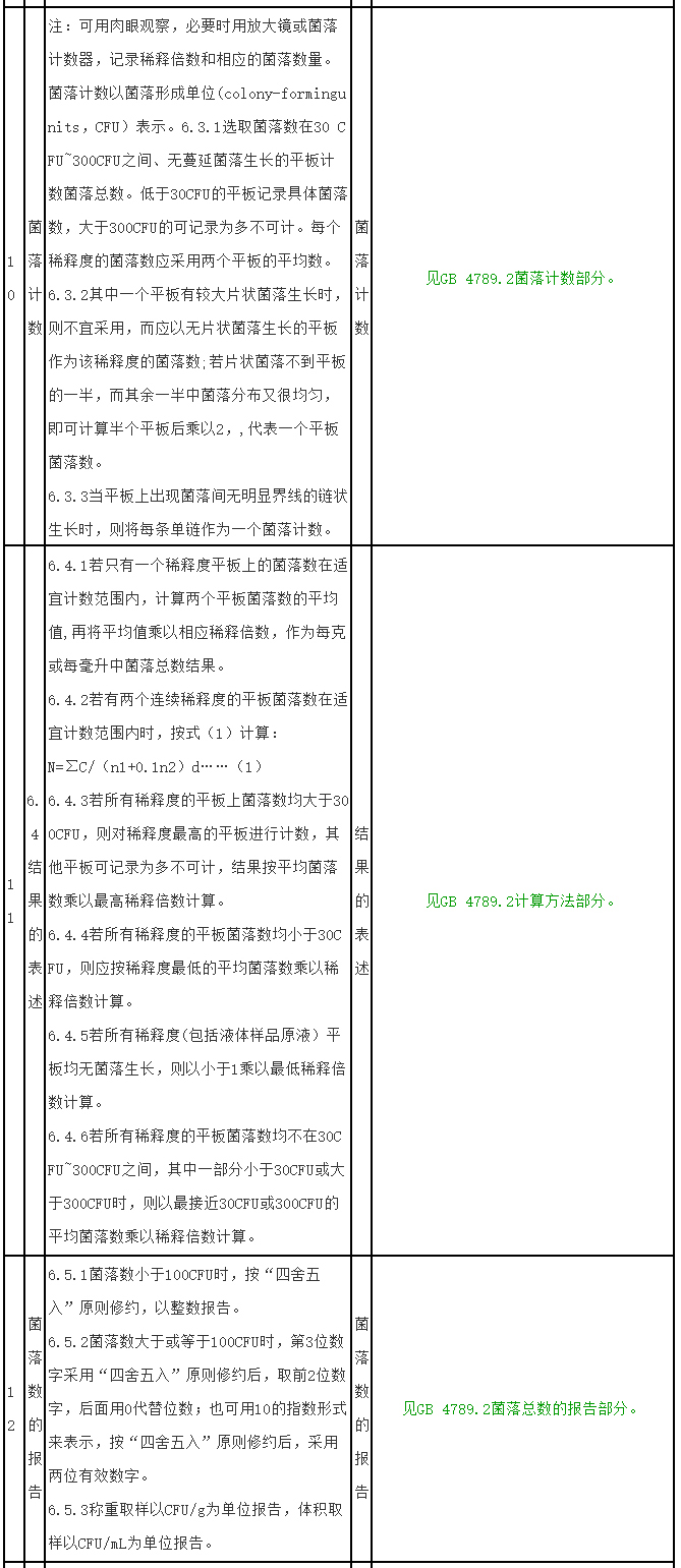 (7)菌落计数和结果表述及报告,均简化描述,直接与GB4789.2对接,采用“见GB 4789.2”相关部分这种表述方式;