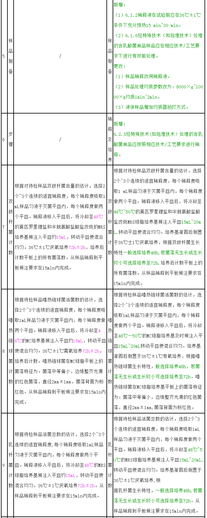 (5)稀释和培养过程中,新增了“经特殊技术(如包埋技术)处理的含乳酸菌食品应按照相应技术/工艺要求进行稀释”;
