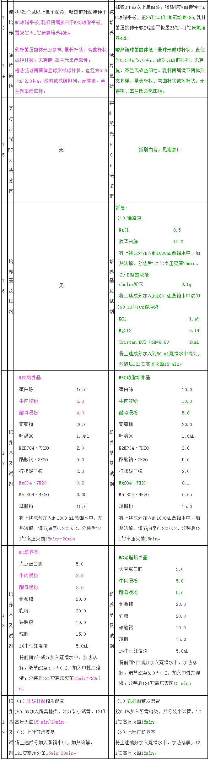 (10)除了新增鉴定方法外,对重要的培养基配方也进行了优化,常用的MRS、MC培养基,在配方和制备条件上都有更新,旧标准中所有的高压灭菌条件均为121℃高压灭菌15min~20min,新版标准中,全部改为“121℃高压灭菌15min”。