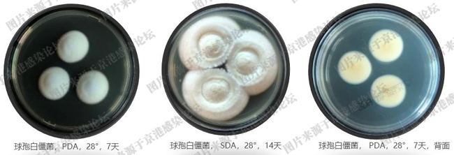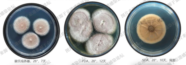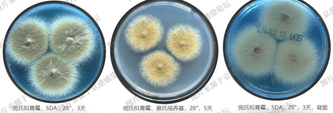 菌落生长速度中等,多为白色,开始为棉絮状,延长培养变粉末状,背面白色。