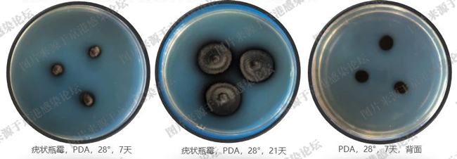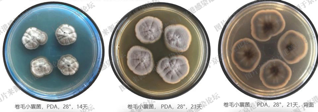 菌落生长快速,开始白色,后中央逐渐变灰褐色至黑色,背面逐渐变黑.