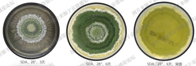 菌落生长速度非常快,爆破式生长。开始为白色,很快菌落中央产绿色孢子,菌落周围有白色菌丝生长带,最后整个菌落变绿色,反面无色至黄色。