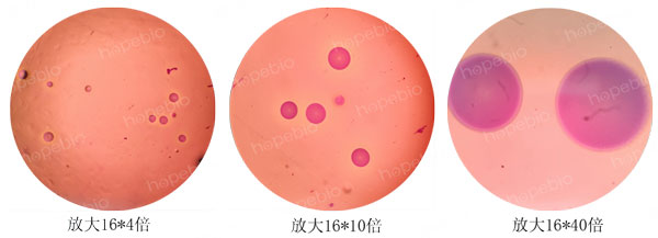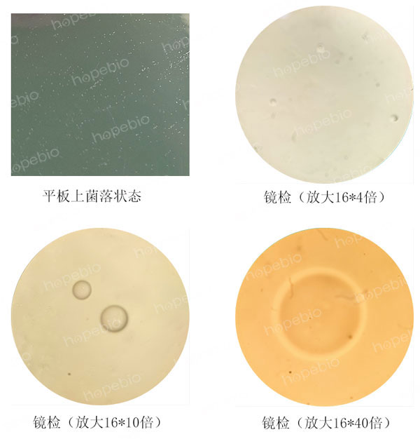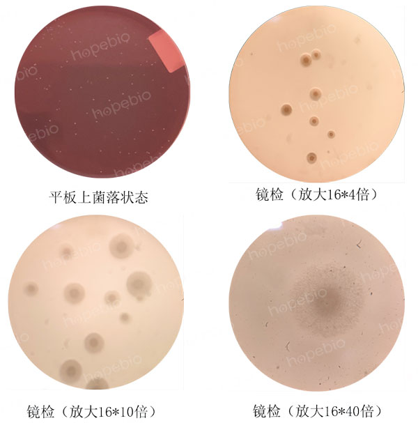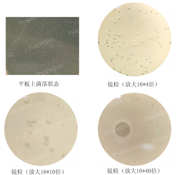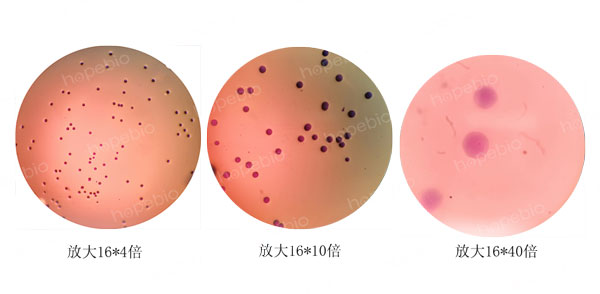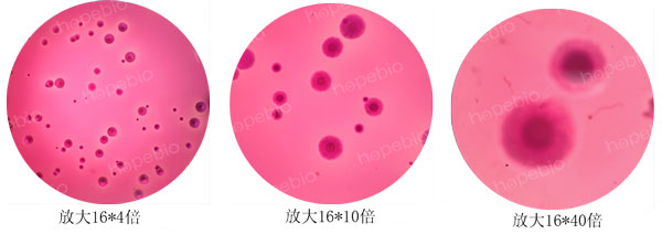 为了增加颜色的对比度,更好的观察检测支原体,可采用加染色液的方法对支原体进行染色,染色还可有效排除气泡的干扰。中国药典采用的为指示细胞培养法即DNA染色法,需要借助特殊的荧光染料和荧光显微镜进行观察。而一般的实验室并不具备这样的条件,因此可以使用更为简单的染色方法,借助两种常用的染料及普通电子显微镜即可观察。具体步骤为:将蕃红染液或结晶紫染液(革兰氏染色A液;HB8278)稀释一定的倍数,直接加入到平板上染色10秒,之后用水冲洗掉,无需切割琼脂块,直接将平板放置于显微镜观察,人肺炎支原体的染色镜检结果如图4所示。