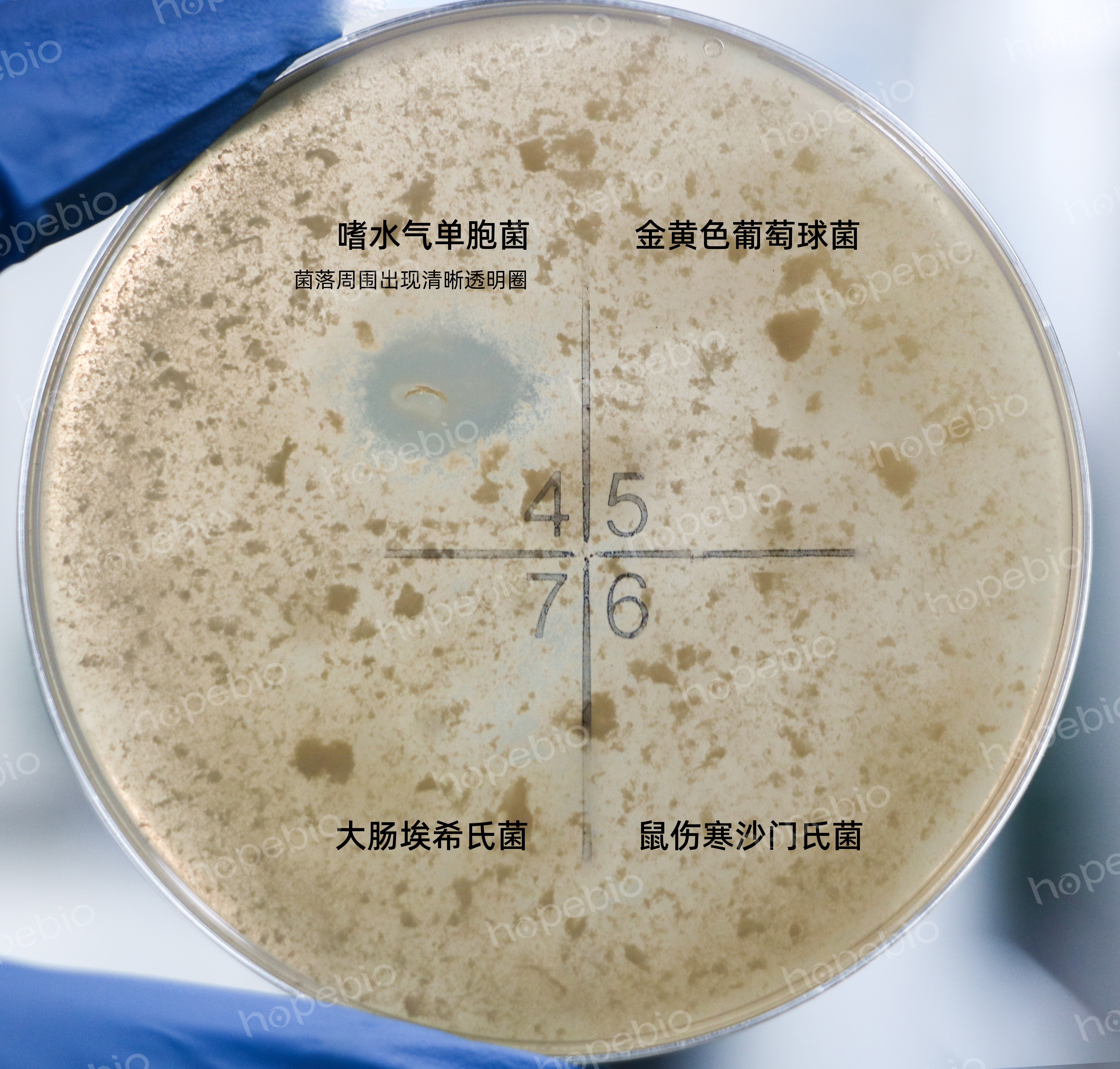 菌落周围出现清晰透明圈 |