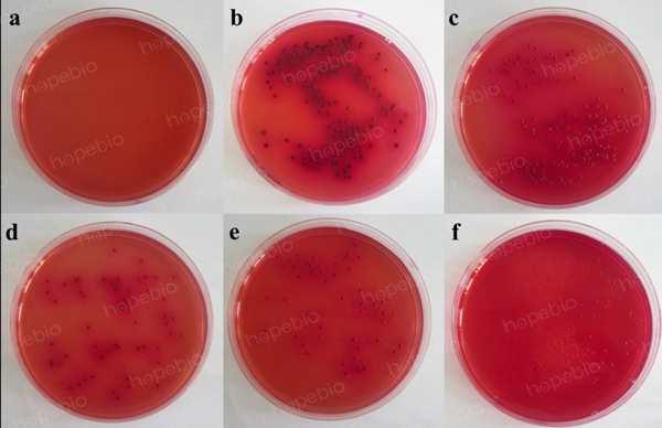 备注:a:阴沟肠杆菌,b:弗氏柠檬酸杆菌,c:产气肠杆菌,d:大肠埃希氏菌,e:沙门氏菌,f:金黄色葡萄球菌