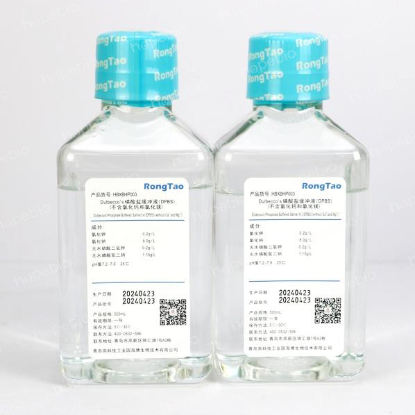 PBS缓冲液具有与PB缓冲液相同的缓冲对:H2PO4-和HPO42-,与PB缓冲液不同的是PBS添加了氯化钠和氯化钾来增加盐离子浓度。PBS缓冲液通常在pH为7.2-7.4使用,具有盐平衡、调节渗透压和一定的pH缓冲作用。DPBS是生物学、生物化学研究中使用较广泛的一种平衡盐溶液,DPBS和PBS的成分相同,但DPBS的Na2HPO4与KH2PO4的添加量略小。另外一部分文献将该PBS缓冲液写成D-PBS缓冲液,并强调是不含钙、镁离子的配方。DPBS主要用于胚胎学方面的研究,可作为胚胎、组织、细胞的漂洗液、冻存液和培养液。可根据需要在D-PBS中加入葡萄糖、丙酮酸钠等,以维持培养物的基本营养。