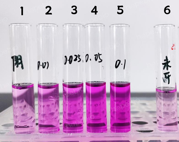 1~5:浓度分别为0EU/mL、0.01EU/mL、0.025EU/mL、0.05EU/mL和0.1EU/mL的内毒素标准液检测结果;6:我公司生产的PBS产品内毒素检测结果。