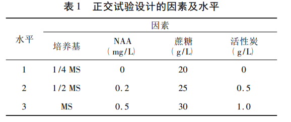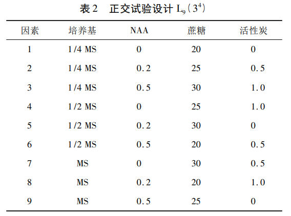 采用L9(34)正交试验设计以培养基、NAA、蔗糖、活性炭为因素,每个因素设3个水平(表1),由L9(34)正交表得到正交试验设计表(表2)。
