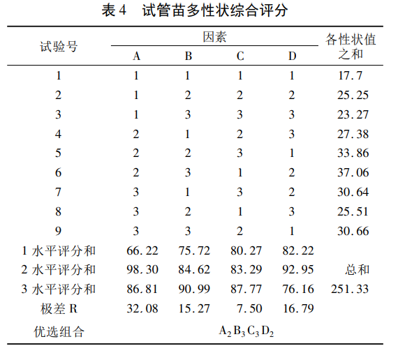 根据统计结果发现,在罗汉果生根壮苗培养过程中,不同激素组合对生根壮苗效果影响较大,株高、茎粗等性状表现出不同的变化规律(表3),由正交试验设计结果(表4)中的极差R大小决定各因素对结果的影响程度依次为:A>D>B>C,即培养基>活性炭>NAA>蔗糖,由此可知,培养基对罗汉果生根壮苗的影响最大。