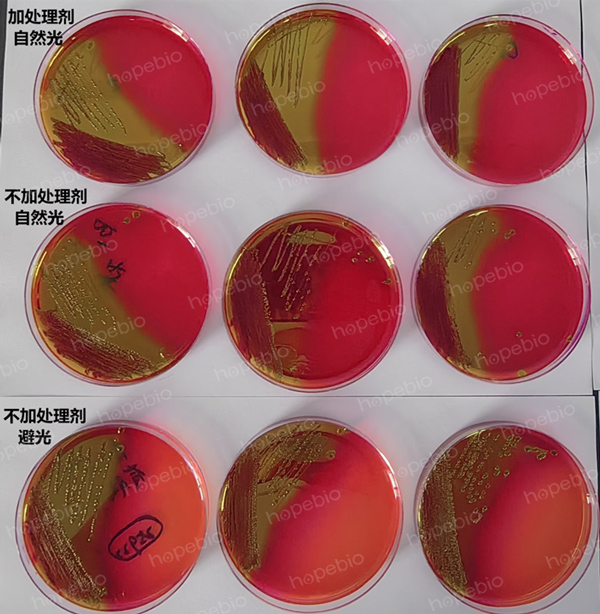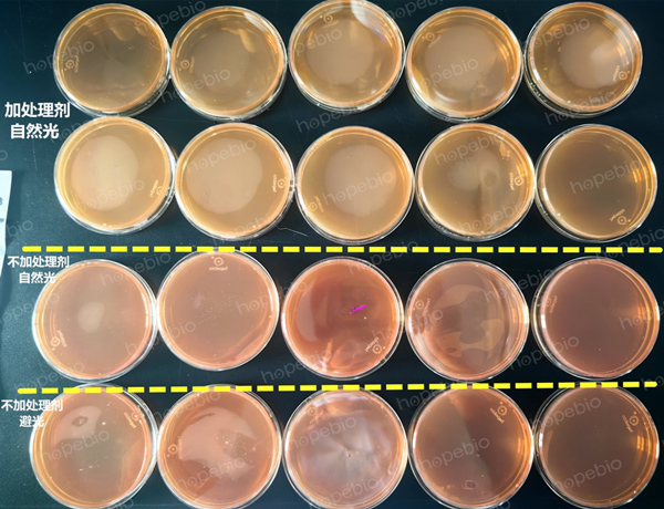 两种培养基平板虽然都存在颜色变化的问题,但解决的方式不尽相同。实际生产中,不同的培养基应根据其特性进行相应的有效处理,保证平板在使用前颜色不发生明显变化。有些培养基颜色变化不影响使用,有些会影响使用,要根据情况判断取舍。