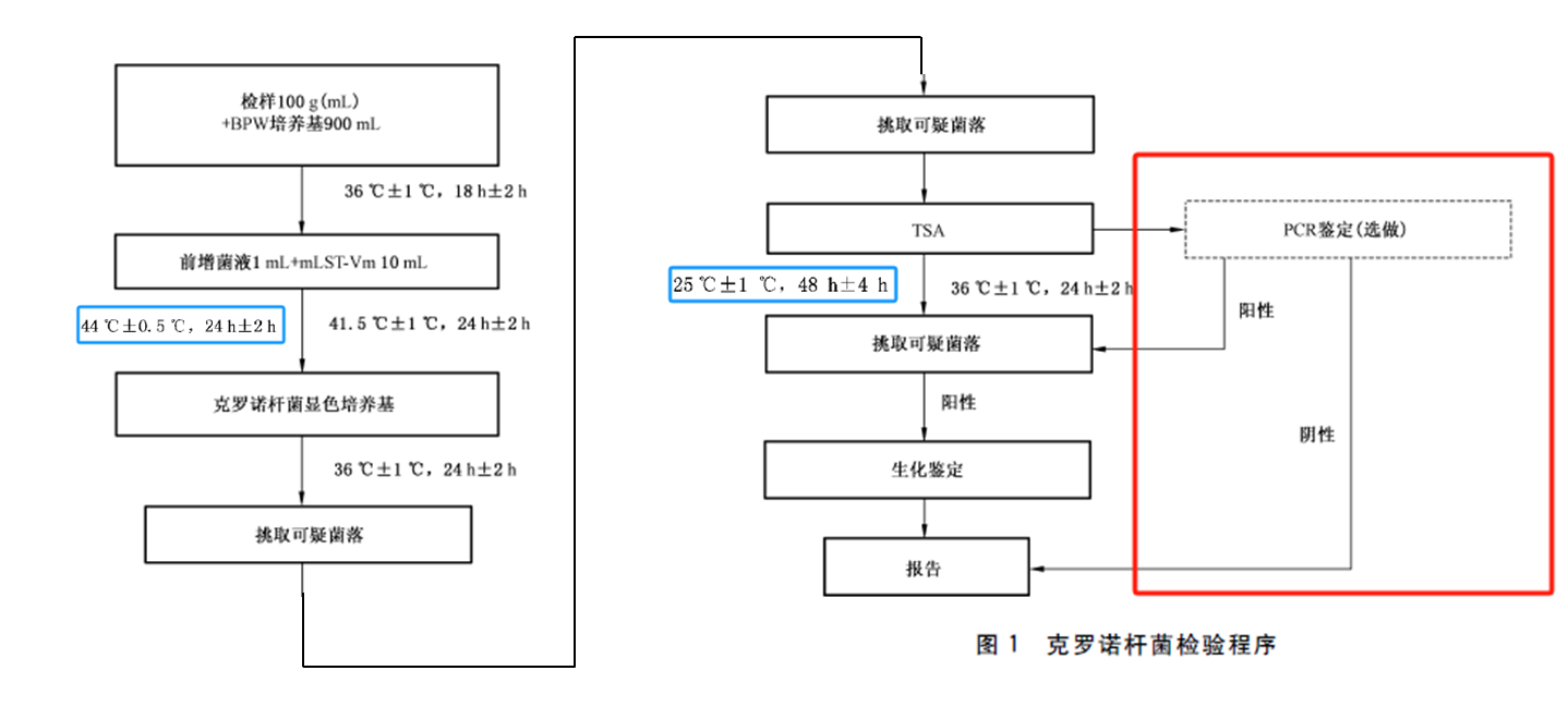 (2)预热、选择性增菌的温度由44℃和25℃更改为41℃、41.5℃和36℃,显色培养基的名称更改。