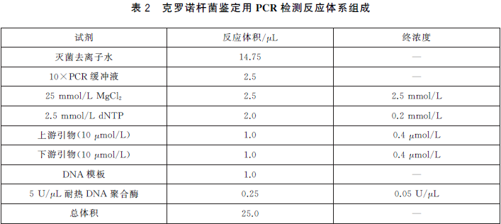 5.3.2 PCR扩增 5.3.2.2 PCR反应体系 PCR反应体系组成见表2。