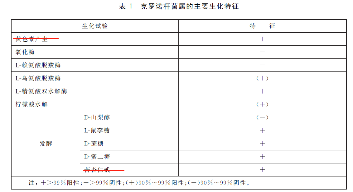 选做5.3时,自PCR结果阳性的TSA平板上挑取菌落进行生化鉴定,PCR结果阴性的TSA平板不再进行生化鉴定。 未选做5.3时,直接将5.2.2的可疑菌落接种TSA平板后进行生化鉴定。 可以首先鉴定克罗诺杆菌显色培养基平板上最具特征性的菌落接种的TSA平板上的菌落。 如果是阳性,则不需要测试其他TSA平板上的菌落。 如果是阴性,则选取其他TSA平板上的菌落进行鉴定,直到全部为阴性或发现阳性菌落为止。 自TSA平板上直接挑取黄色可疑菌落,进行生化鉴定。 为确保结果的准确性,对TSA平板上的菌落进行鉴定时,应使用新鲜的传代菌落。 克罗诺杆菌属的主要生化特征见表1。 克罗诺杆菌的主要生化特征见表3。