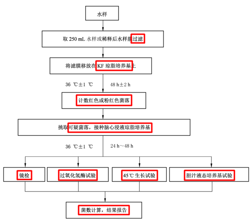 粪链球菌又叫粪肠球菌,是一种革兰染色阳性球菌。粪肠球菌是人体肠道内的正常菌群,人的大便中含有大量的粪肠球菌,每克粪便中大约有107个粪肠球菌。粪肠球菌通常不感染人,但在人应用抑制免疫力药物导致人体免疫力下降等情况下,会导致粪肠球菌感染。粪链球菌检验是饮用天然矿泉水检验标准的必检项目。参考标准为《GB 8538-2022 食品安全国家标准 饮用天然矿泉水检验方法》。粪链球菌的检验程序如下(图1):