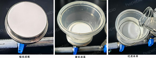 用无菌镊子夹取无菌滤膜边缘部分,贴放在已灭菌的滤头上,固定好滤器,将250mL水样或稀释后的水样,通过孔径0.45μm的滤膜过滤(如图2)。