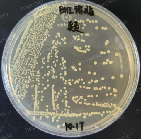 a、从滤膜上按比例挑取10个不同形态的可疑菌落(不足10个则全挑),接种到脑心浸液琼脂培养基平板上,36℃±1℃培养24h~48h(如图5)。