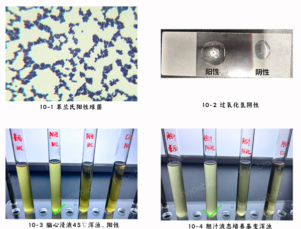 e、若可疑菌落为革兰氏阳性球菌,过氧化氢酶反应阴性,且分别接种至两种培养基中,培养后使两种培养基均变浑浊,则确证为粪链球菌(图10)。