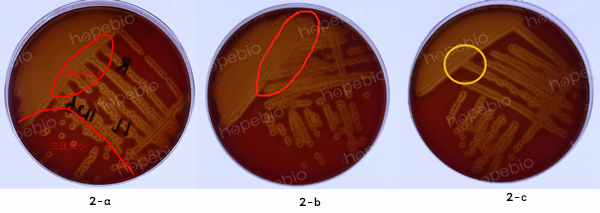 造成菌落生长过密的原因主要有以下几个方面:没有充分利于好划线区域(如图2-a);各区域线过于密集,线与线之间重叠(如图2-b);与前一区交叉过多(如图2-a,2-c);或者划线时接种环接触点变动,未始终保持接种环的一点接触琼脂表面,造成3区沾附的菌太多。