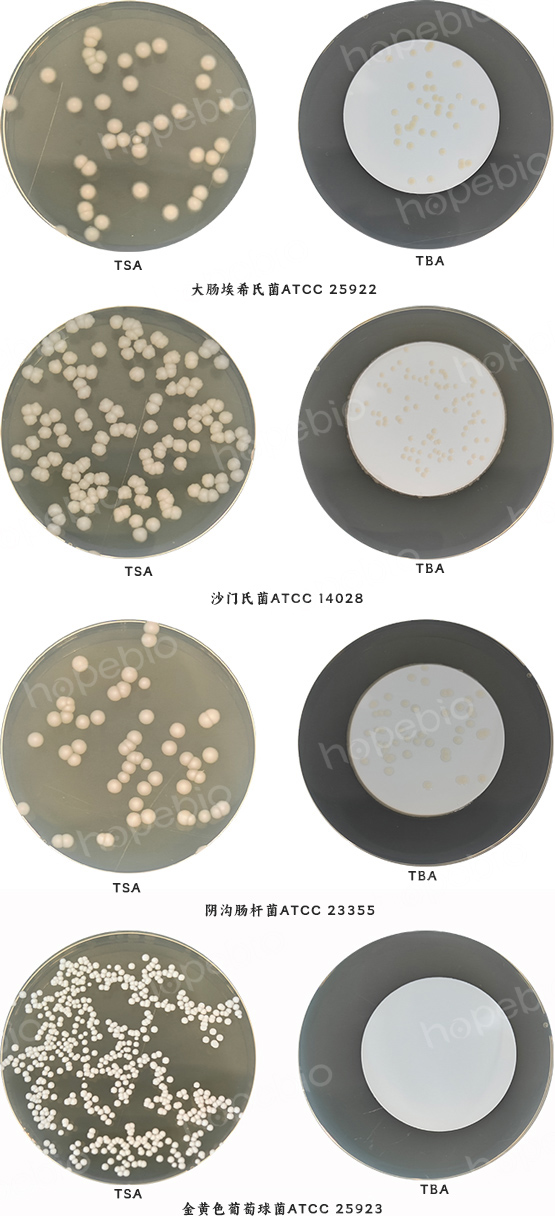 2、将质控菌株稀释至合适浓度,抽滤至滤膜上,将滤膜放置于培养基上,胰蛋白胨大豆琼脂培养基(TSA)作为参比培养基。