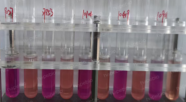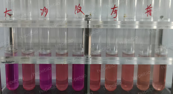 原理:培养基以酚红为指示剂,pH在6.8±0.2,酚红显橙黄-橙红色色,接种细菌后无需覆盖液体石蜡。若细菌可分解精氨酸产碱,则试验管的pH上升,培养基会逐渐变红,而对照管没有精氨酸,颜色通常不会有明显改变,通过试验管与对照管颜色对比可判断细菌是否能分解精氨酸产碱。