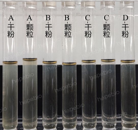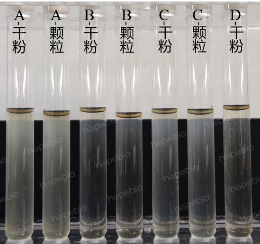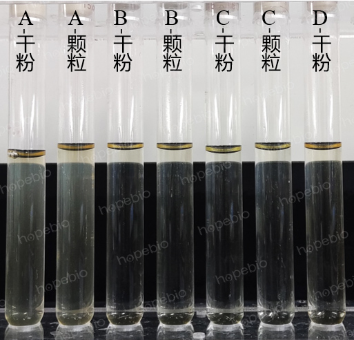 如图4可知,单增李斯特氏菌在不同厂家BPW培养基中培养8 h后,所有培养基的增菌效果不明显,通过浊度对比,能看到厂家A的BPW培养基浊度稍浓,其试验结果为A(干粉)=A(颗粒)>B(干粉)=B(颗粒)=C(干粉)=C(颗粒)>D(干粉),即海博的BPW浑浊度明显最高,表明增菌效果最佳。
