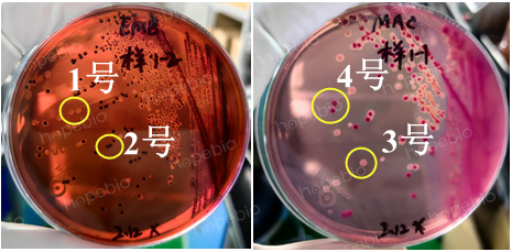 图1 EMB和MAC平板上的1号~4号菌落