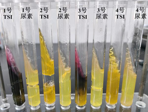 由图4可知,1、3号菌落TSI琼脂变黑,说明产H2S阳性,可直接判别为非大肠埃希氏菌。