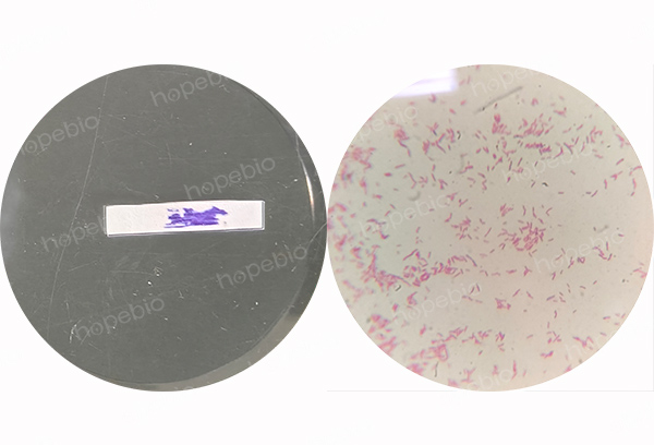 由图4、图5可知,2、4号菌落TSI斜面产酸(变黄)、底层产酸(变黄)、产H2S阴性(TSI琼脂不变黑),靛基质阳性(蛋白胨水滴加Kovacs氏靛基质试剂后变红)和尿素琼脂阴性(变黄),因此,基本可判别2、4号菌落为大肠埃希氏菌,为进一步验证,对其进行氧化酶试验及革兰氏染色,氧化酶试验结果阳性及革兰氏染色结果阴性,如图6所示。