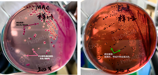 (左:MAC平板,砖红色或桃红色菌落; 右:EMB平板,紫黑色,带或不带金属光泽)