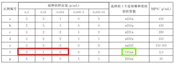 (4)如果不能按照本规则找到3个合适的稀释度,则从前一个较低的稀释度开始,选择3个连续稀释度(见表示例e);