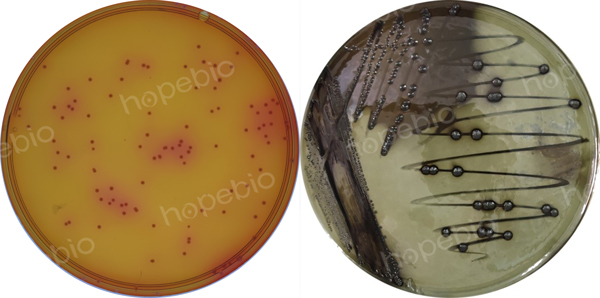 从每种选择性平板的每个平皿中选择2~3个典型或可疑菌落接种至营养琼脂37℃下培养22h进行纯化。使用纯化后的菌落进行证实试验。