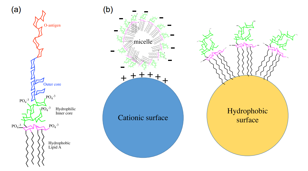 图2 (a)来自大肠杆菌内毒素的化学结构示意图,(b)内毒素以胶束,立方体,层状或囊泡的形式聚集(图片引自Schneier和Razdan,2020)ADDIN NE.Ref.{CC0B34E6-1785-43CF-82ED-9572F90406B6}[2]