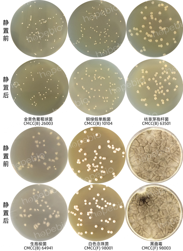 3、放置于20℃-25℃需氧培养45min,混匀后涂布于对应的计数培养基上。比较静置前后菌落数的变化。