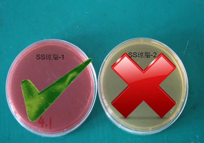 以SS琼脂为例,其中的中性红指示剂见光易分解,如果长时间将培养基置于光照条件之下,中性红分解,造成平板颜色变黄,影响培养基正常使用、判断,如下图可见: